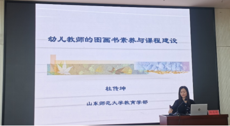 山东师范大学博士生导师杜传坤教授作“幼儿教师的图画书素养与课程建设”的主题报告。杜传坤教授梳理了儿童图画书教育兴起的背景和条件,提出了幼儿教师须具备的图画素素养,指出儿童图画书教育中教师的短板,最后以案例形式提出了以课程建设提升幼儿教师图画书素养的几点建议。