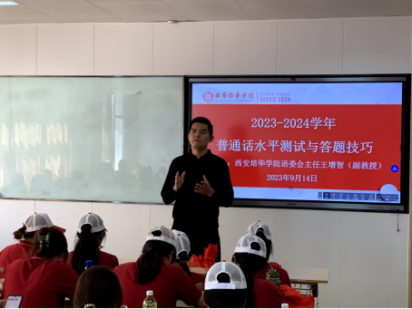 9月12日,人文与国际教育学院学前教育系副教授,校语委会办公室主任王增智为2023级学前教育本科专业的50名新生开展了以“普通话水平测试与答题技巧”为主题的培训活动,王主任生动地为同学们讲述了普通话的学习方法和测试答题技巧,明确了学好普通话对同学们所在专业的重要性,同学们培训后主动要求王主任建立学习专用微信交流群。