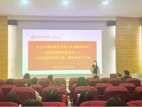 为提升教师教科研能力,促进教师专业能力发展,人文与国际教育学院中文系于2023年10月11日(周三)16点10分在格物楼J101会议室开展专题讲座教研活动,主题为“写作类课程的新思考——小说创作的视角对象、神秘性和不可知”,由仵埂教授主讲,中文系庞欢副主任主持,中文系全体教师参加此次活动。