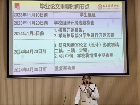 然后由法学系论文组负责人江欣燕老师向同学们详细介绍了法学系2024届毕业论文的重要时间节点和毕业论文指导老师的相关信息,提醒同学们按时完成论文相关工作。
