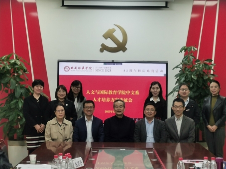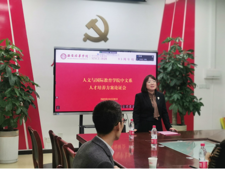 为进一步全面提升中文系本科人才培养质量,完善本科教学内容与课程体系,更好地完成应用型人才的培养目标,10月20日下午,人文与国际教育学院中文系在格物楼第四会议室举行人才培养方案论证会。西北大学硕士研究生导师杨炎华副教授、西安市阿房路一校校长李俊杰、西安超星教育科技有限公司人事总监马云志、西安博胜影视传媒有限责任公司总经理丑兵、陕西省汉语国际教育研究会副会长张天印、《国际中文教师证书》西安外国语大学考点负责人张青博士受邀参加论证。人文与国际教育学院科研副院长、中文系学科带头人傅教授,中文系学科带头人仵埂教授,中文系副主任罗妮副教授、申艳霞副教授,中文系课程负责人王中俊副教授以及中文系代表教师张莉霞、张萍、常翠岩等参加此次论证会,会议由罗妮副主任主持。