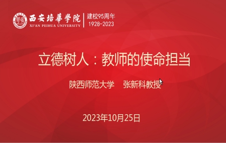 2023年10月25日14:30,由教师教学发展中心、党委教师工作部和人文与国际教育学院共同举办的西安培华学院95周年校庆系列活动之培华大讲堂在维之图书馆顺利拉开帷幕,此次讲座特邀教育部全国高校黄大年式教师团队负责人、长江学者、陕西省教书育人楷模、陕西师范大学文学院教授、博士生导师张新科教授,作“立德树人:教师的使命担当”主题讲座。西安培华学院理事长姜波博士、西安培华学院校长李映方教授、西安培华学院副校长刘越莲教授以及各二级学院领导出席了讲座,四百名教师代表参加了讲座。讲座由西安培华学院副校长刘越莲教授主持。