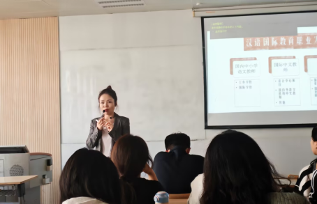 与此同时,朱老师着重介绍了汉语国际教育行业在国内外的发展现状和作为国际中文教师必备的能力。朱老师将丰富的个人海外经历和最新的国内国际政策相结合,从汉语国际教育职业发展现状、中外语言合作交流中心和汉语国际教育专业的考研方向入手,为学生们描绘了长远可行的发展蓝图。