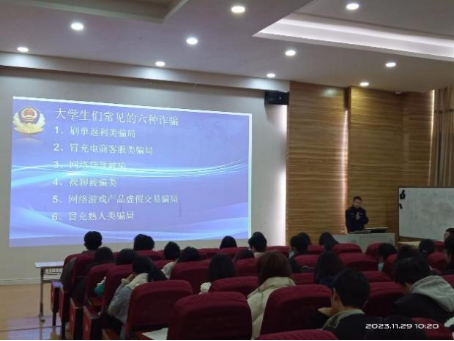接着,刘洋警官详细分析了大学生中常见的六种诈骗,分别是:校园贷诈骗、兼职诈骗、网购诈骗、恋爱诈骗、中奖诈骗、募捐诈骗。他用真实的案例和数据,揭示了这些诈骗的手法和危害,教育同学们要理性消费,慎重选择,谨慎交友,理智判断,自觉抵制,积极举报。