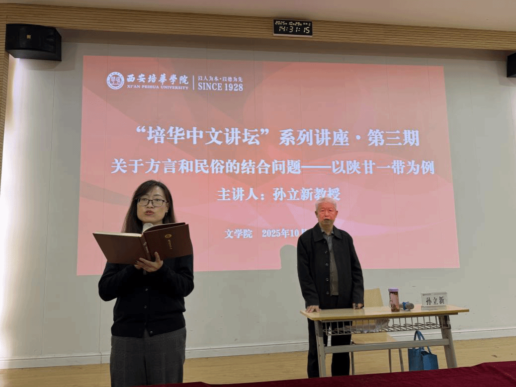 为深化文学院师生对方言与民俗文化关联性的认知,推动地域文化研究与学术视野拓展,文学院于2025年10月29日在J201组织召开第三期“培华中文论坛”。本次讲座由陕西省社会科学院研究员、西安培华学院孙立新教授主讲,申艳霞副教授主持,文学院语言学教研室教师及部分学生参加。本次讲座主题为“关于方言与民俗的结合问题——以陕甘一带为例”,重点聚焦方言与民俗的交融共生关系,为全院师生搭建了一场兼具理论深度与地域特色的学术交流平台。