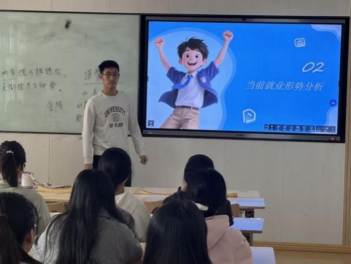 紧接着,主讲人结合当下就业市场动态,开展“当前就业形势分析”主题分享。通过形象案例与专业数据,主讲人剖析了就业环境中的机遇与挑战,引导同学们结合自身专业、优势思考职业发展路径,帮助大家更理性地洞悉职场趋势,为未来职业选择锚定方向