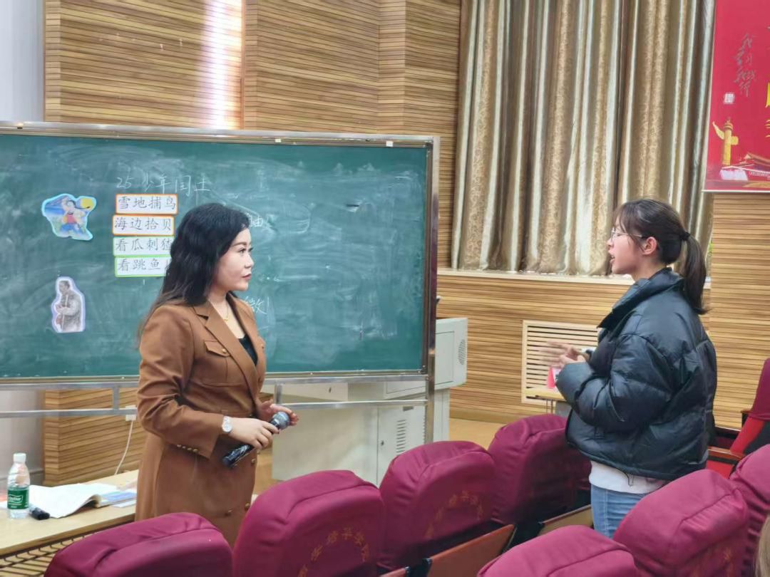 示范展示结束后,高级教师、陕西省教学能手刘颖珊校长展开专业点评与系统指导。她首先从教学目标设定、教学环节设计、师生互动引导、语言表达规范四个维度,精准提炼徐雨婷老师课堂的亮点:“导入环节紧扣文本背景,有效激发学习兴趣;任务设计分层递进,符合小学生认知规律;互动引导自然流畅,充分体现学生主体地位”,同时结合教资面试评分标准,提出“可进一步强化重难点的语言标识,让评委快速捕捉教学核心”的优化建议。