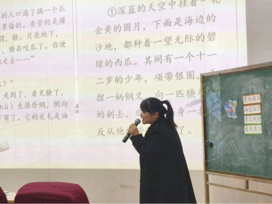 在教学展开环节,徐雨婷老师设计了三个层层递进的教学任务,实现知识传授与能力培养的有机统一:一是“制作人物名片”,引导“学生”从外貌、动作、语言等细节梳理闰土的人物形象,夯实文本解读基础;二是“场景卡片排序”,以“雪地捕鸟、海边拾贝、看瓜刺猹、潮汛看鱼”四个核心场景为载体,帮助“学生”理清文章叙事脉络;三是“经典语句赏析”,聚焦“深蓝的天空中挂着一轮金黄的圆月,下面是海边的沙地,都种着一望无际的碧绿的西瓜……”等名句,品味文字的画面感与情感张力。