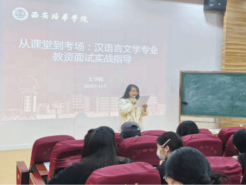 为切实提升汉语言文学专业学子教师资格证面试竞争力,夯实教学实践基本功,帮助学子明晰面试核心要领、掌握微型课教学技巧,2025年11月26日14:00-16:00,西安培华学院文学院于格物楼J101隆重举办以“从课堂到考场:汉语言文学专业教资面试实战指导”活动。本次活动特邀西安市鄠邑区东关小学校长刘颖珊、优秀语文教师徐雨婷两位老师联袂授课,文学院院长助理张萍老师及吕明凤、杨皓明、于笑颜等老师作为嘉宾出席,活动由张媛老师主持。