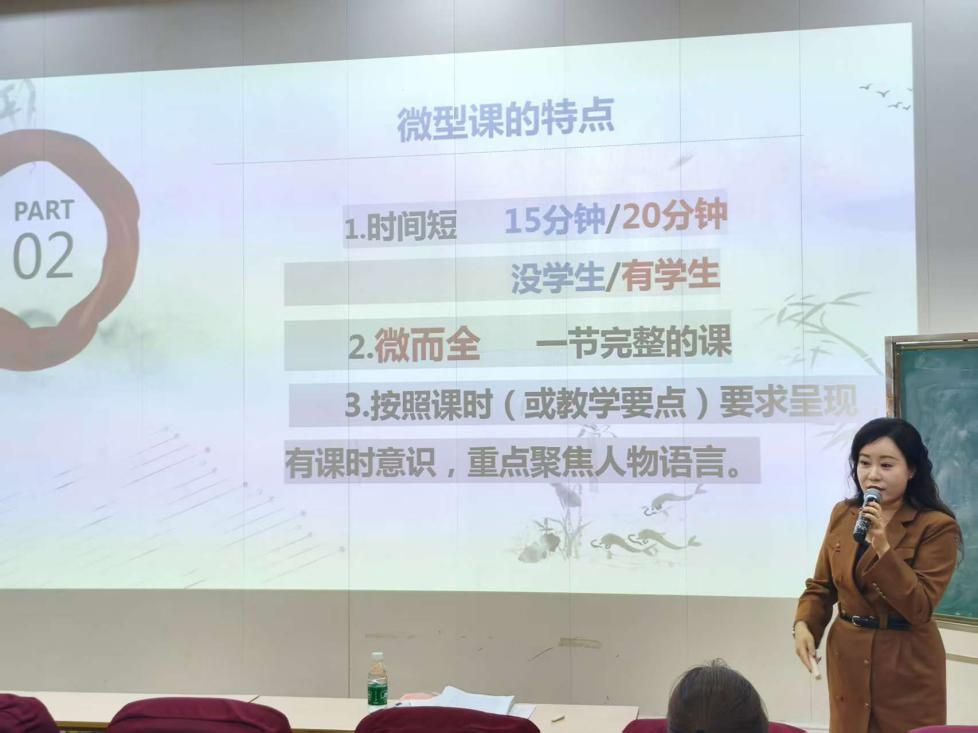 随后,刘颖珊校长围绕“微型课的核心认知与实操技巧”展开专题分享,结合自身27年跨学段教学及面试评审经验,进行全方位拆解。她明确界定微型课的概念:“微型课是在时间上压缩、目标及内容上‘瘦身’,突出重难点并直击教学主问题,同时关注学生学习活动、提高教学效能,且教学环节不减少的‘微而全’课堂呈现”。针对微型课的特点,她强调:“其一,时长通常为15-20分钟,需适应‘有学生’或‘无学生’两种场景;其二,‘微而全’是核心,虽篇幅精简,但导入、新授、巩固、总结、作业等环节缺一不可,是一节完整的课堂;其三,需具备课时意识,重点聚焦人物语言、文本解读等核心教学要点”。