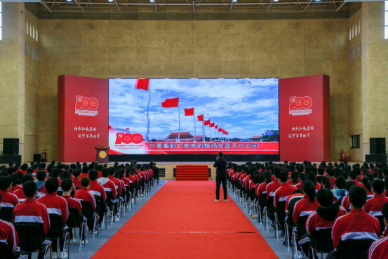 10月15日上午10时庆祝建党100周年天安门前国旗捐赠西安培华学院传递仪式在西安培华学体育馆庄严举行。据悉,此面国旗是中国共产党成立100周年活动,天安门前百面红旗之一。田径场是本次国旗校园专递活动的第一站,在这具有特殊意义的国旗传递仪式上,西安培华学院体育学院全体学生用自己的表演向国旗致敬,向中国共产党百年华诞献礼,祝福党的伟大事业走向辉煌,让民族复兴路上九千万星火燎原。