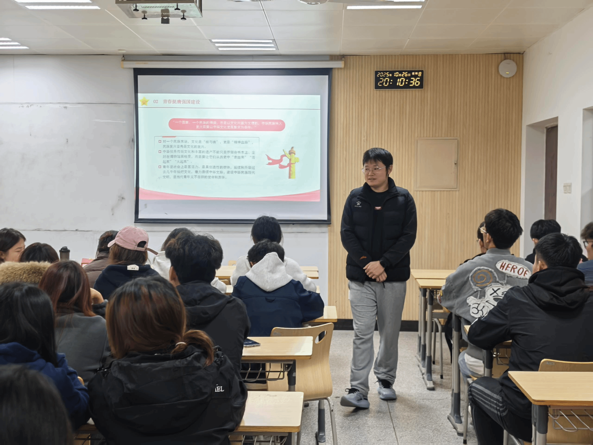 在“信念培根”层面,党支部开展了专题主题党日活动。杜晓婷书记以“立志做新时代挺膺担当的奋斗者”为主题,为全体学生党员讲授专题党课。党课通过重温入党誓词、学习先进典型、开展座谈交流等形式,引导学生党员深刻领会“立报国强国大志向”的时代内涵,要求大家将个人理想融入国家发展大局。辅导员雍笑笑组织各班级召开"青春献礼新时代,强国有我新征程"主题班会,组织学生学习新时代先进人物事迹。辅导员霍逸凡则通过线上主题班会,结合学生专业特点开展职业生涯规划指导。