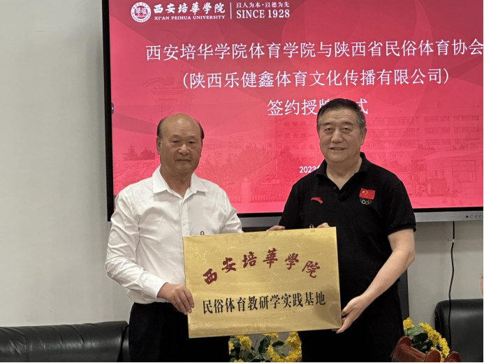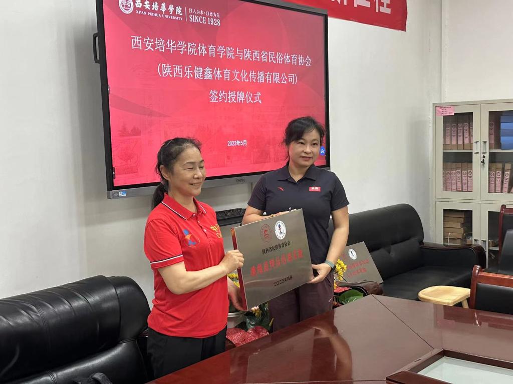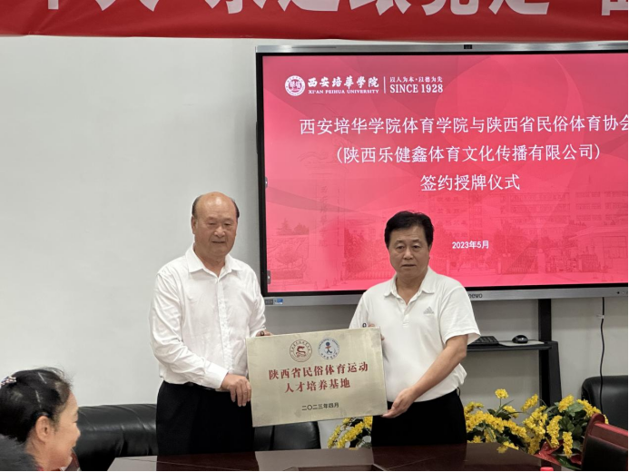 为了进一步加快校企合作,推动产教融合,拓宽就业渠道,推进实现人才培养目标新举措。2023年5月17日下午三点,西安培华学院体育学院与陕西省民俗体育协会(陕西乐健鑫体育文化传播有限公司)签约授牌仪式在体育学院会议室隆重召开。