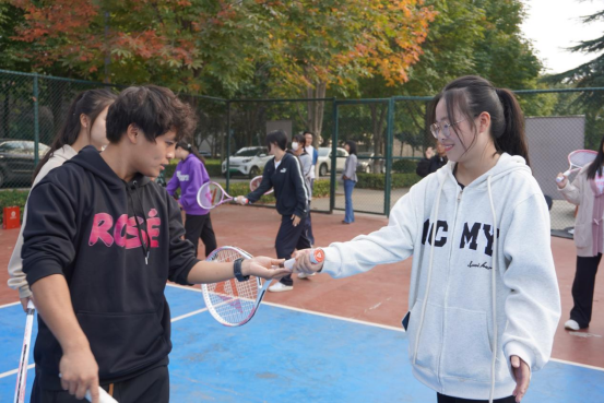 王天虎指导新生网球技术(左一王天虎)