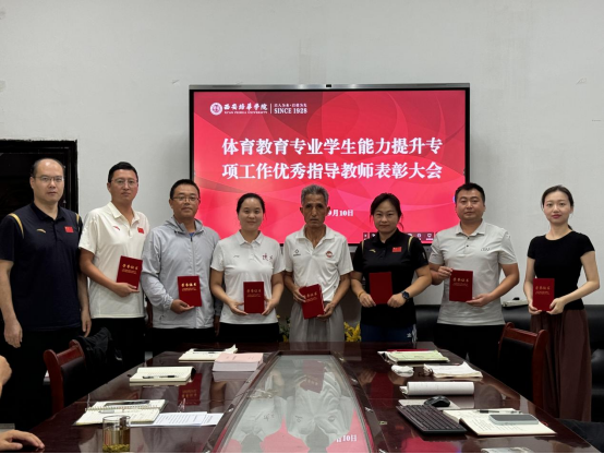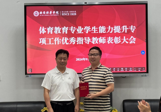 接着,马德厚书记宣读了优秀指导教师表彰名单。今年,体育学院共有7位同学考研成功,这一成绩的取得离不开学业导师和辅导员的悉心指导与关怀。王志强院长为辅导员陈新华颁发证书,马德厚书记为考研学生的学业导师苟定邦、雷耿华、张锦锦、刘利锋、刘毅、赵欣莹、崔成老师颁发了荣誉证书,赞扬他们在学生考研过程中所付出的努力。他表示,这些老师不仅在专业知识上给予学生指导,还在心理上给予学生支持和鼓励,帮助他们克服了重重困难,最终实现了自己的考研梦想。