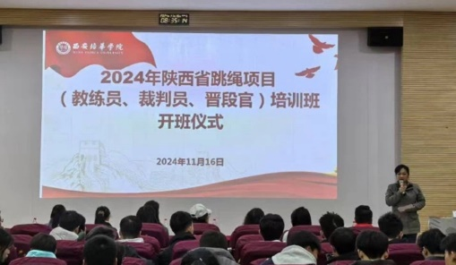 在全民健身浪潮下,陕西省跳绳运动蓬勃发展,花样跳绳凭借其灵活性、趣味性等特点,逐渐成为日常锻炼的热门选择。2024年11月16日,备受瞩目的陕西省跳绳项目(教练员、裁判员、晋段官)培训班(西安培华学院站)隆重开班。参与开班仪式的嘉宾有陕西省民俗体育协会杨坤主席、陕西省学生体育协会培训部项目主管谢妮娜、西安培华学院体育学院副院长雷耿华教授、陕西省民俗体育协会跳绳专项委员会主任刘利、陕西省民俗体育协会跳绳专项委员会教练委员王阿朝、陕西省民俗体育协会跳绳专项委员会培训部副主任邵斌、本次培训讲师:国家级裁判员、高级教练员:陈璐、许海峰等。同时还有众多跳绳爱好者、体育从业者以及相关嘉宾齐聚一堂,共同见证这一重要时刻。