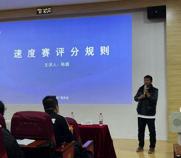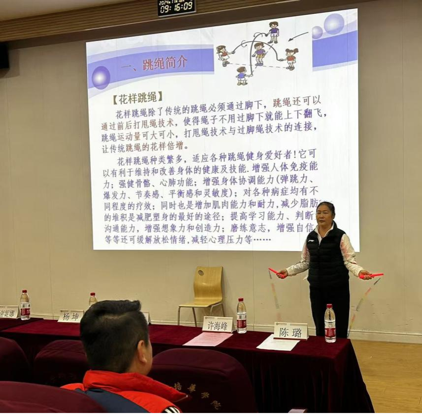 在紧张且充实的培训中,各位培训讲师从跳绳的历史及发展现状、跳绳竞赛规则的解读、评分规则的要点、技术动作的详细示范与讲解等方面进行了专业授课。通过现场示范、播放视频案例等多种直观方式,让大家更清晰地理解跳绳运动。授课氛围轻松且热烈,学员紧跟讲师,认真听讲,针对疑惑之处能积极提问。