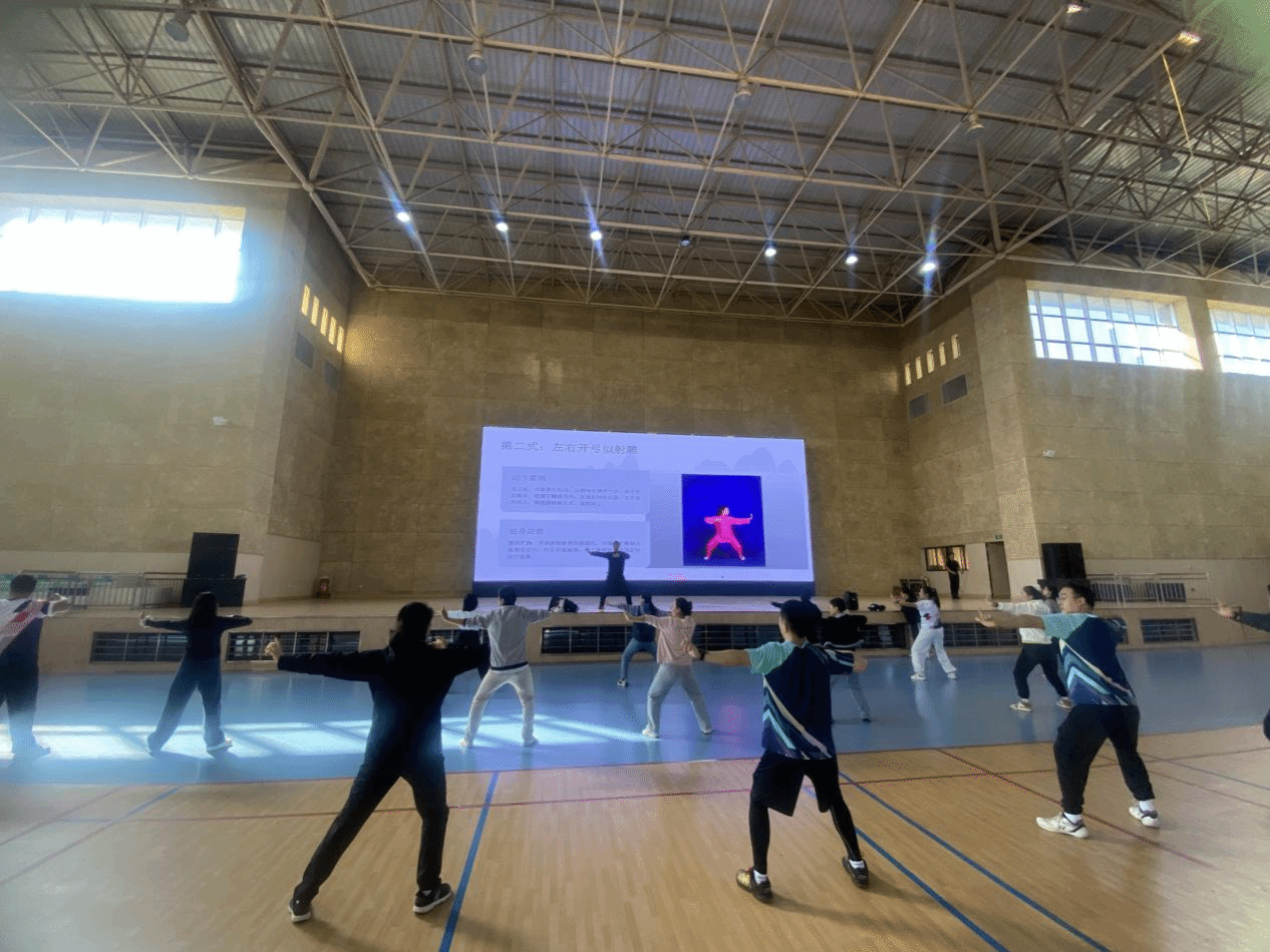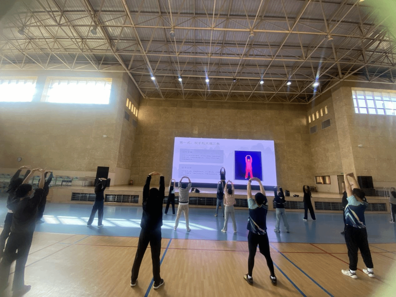 在八段锦基础教学环节,丁景阳老师先讲解八段锦的起源与文化背景,让教职工们感受传统养生文化的魅力;随后详细介绍标准八段锦八个动作的名称与特点,通过现场示范配合动作要领讲解,帮助大家精准掌握动作细节;针对教师久坐、久站的工作特点,丁老师还特别提示了相关动作的练习重点,让教学更具针对性。