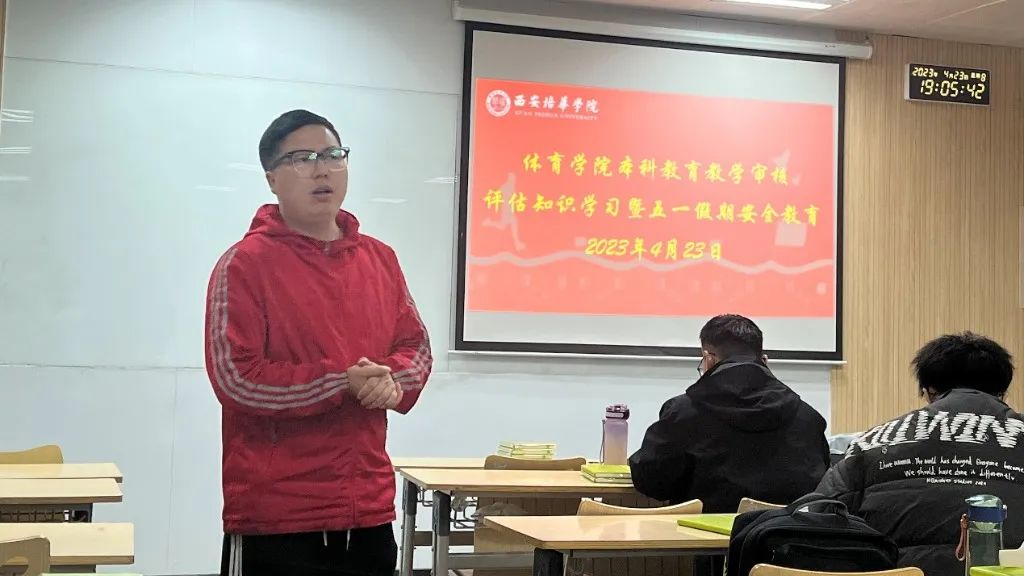 为进一步推进本科教育教学审核评估学习宣传,营造“人人参与评估、评估人人知晓”的氛围,为体育学院学生的成长成才创建良好的学习氛围和生活环境,我院于2023年4月23日开始针对三个年级分时段,在育英楼3308教室召开了体育学院本科教育教学审核评估知识学习暨五一假期安全教育座谈会。西安培华学院体育学院党支部书记马德厚、辅导员、全体学生参加了此次会议。