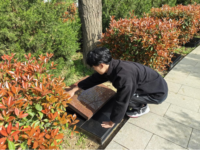 学生心怀敬意为烈士墓碑认真擦拭、打扫。大家在烈士墓碑前低头鞠躬、真诚默哀,寄托对烈士的哀思。同学们低吟致悼词表达心中那份对先烈的沉重情感,以示对先烈们的缅怀和敬意。