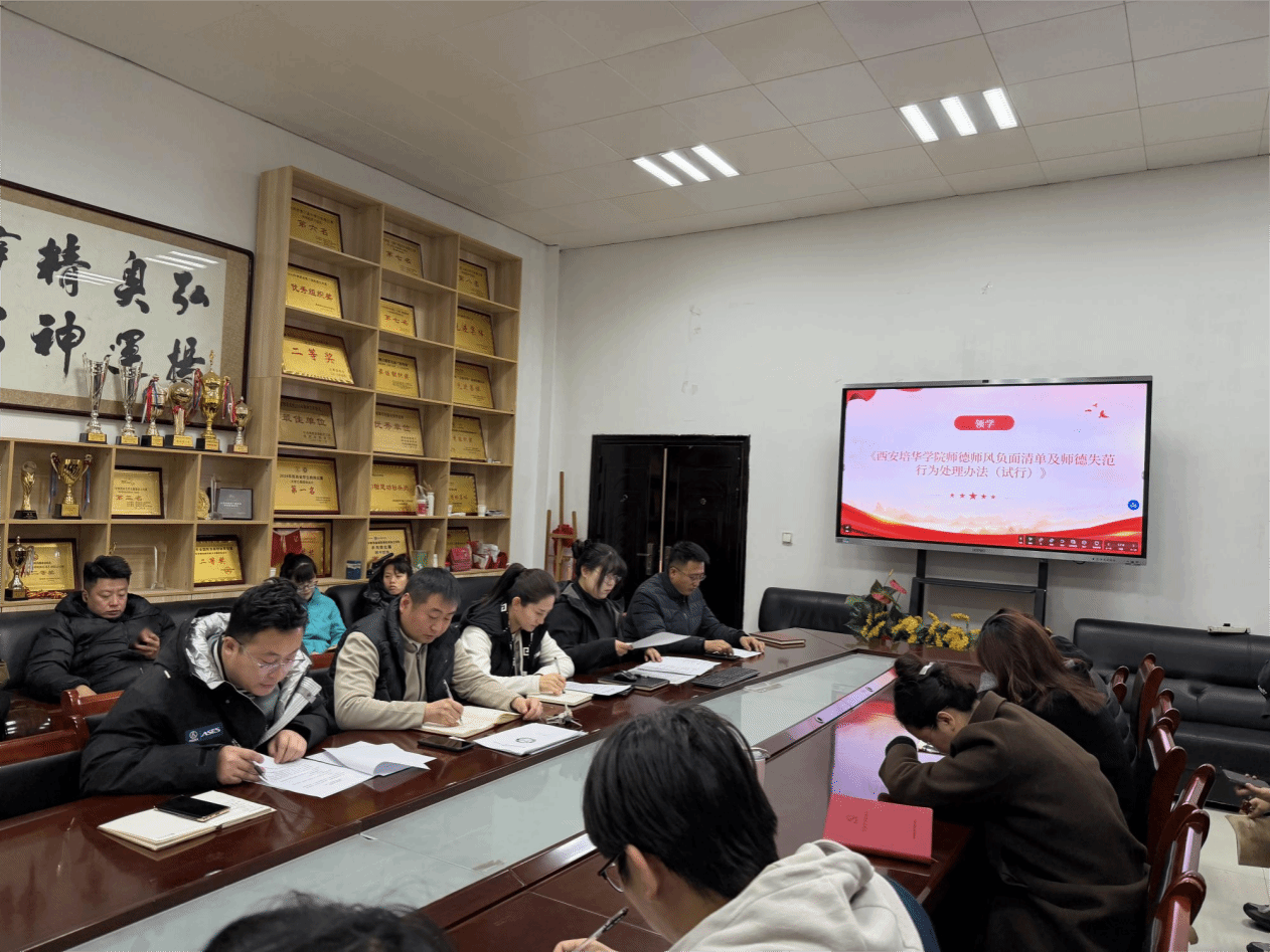 教工党支部宣传委员张恒带领学习了《西安培华学院师德师风负面清单及师德失范行为处理办法(试行)》。该办法结合学校实际,列出了六个方面53条具体负面行为清单,涵盖了思想政治纪律、教育教学管理、学术伦理道德等重点领域,为教师日常行为提供了明确指引。