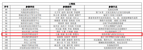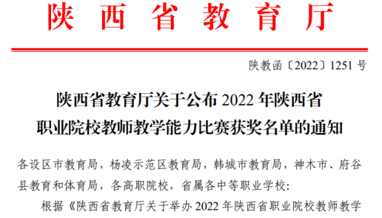 11月19日,陕西省教育厅公布了2022年陕西省职业院校教师教学能力比赛获奖名单,西安培华职业高中教师王淼、张丽、张小妮、薛楚凡的参赛作品《商务形象与商务交往礼仪》荣获2022年陕西省职业院校教师教学能力比赛专业课程组三等奖。