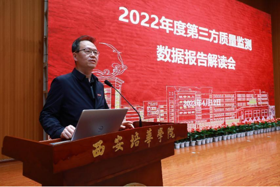 4月12日下午,学校在维之图书馆报告厅组织召开了2022年度第三方质量监测数据报告解读会。会议邀请第三方评价机构麦可思研究院副院长、咨询总监马妍解读报告。全体校领导、各职能部门及二级学院领导班子成员、教师代表近四百人参加会议。发展规划与质量建设中心主任赵巍主持会议。