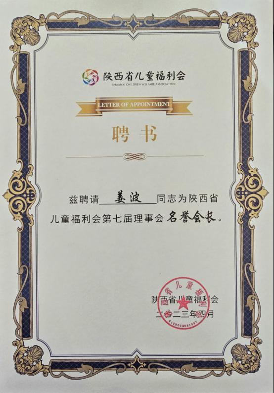 姜波理事长当选陕西省儿童福利会第七届理事会名誉会长
