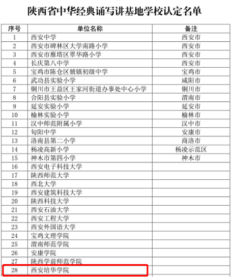 近日,陕西省教育厅发布《陕西省语言文字工作委员会办公室关于公布首批陕西省中华经典诵写讲基地名单的通知》,西安培华学院获批为首批陕西省中华经典诵写讲基地学校。