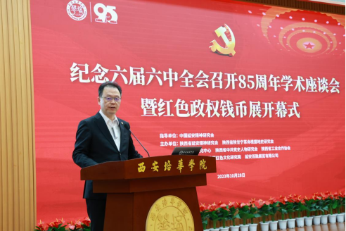 10月28日,纪念六届六中全会召开85周年学术座谈会暨红色货币展在西安培华学院长安校区举行。在陕革命前辈亲属代表,全省社科界、高等学校专家学者,企事业单位代表等出席会议。陕西省红色文化研究院理事长、西安培华学院理事长姜波,党委书记罗新远等师生代表200余人参加了会议。