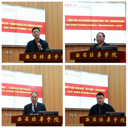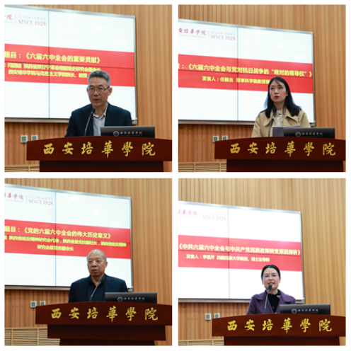 西安培华学院马克思主义学院院长闫团结教授作了《六届六中全会的重要贡献》的发言,军事科学院教授任振杰(由西北政法大学副教授岳国芳代表)作了《六届六中全会与党对抗日战争的“绝对的领导权”》的发言,陕西省延安精神研究会代表、陕西省委党校原副校长、陕西延安精神研究会原常务副会长郑志飚教授作了《党的六届六中全会的伟大历史意义》的发言,西藏民族大学博士生导师李荟芹教授作了《中共六届六中全会与中国共产党民族政策转变原因探析》的发言。
