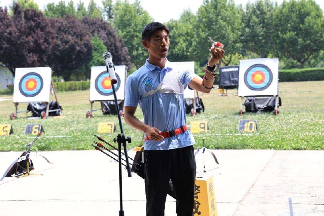 学生射箭队队长马丞讲解使用操作要领、演示护具穿戴