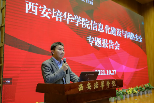 10月27日下午,2021年“国是论坛”——第八届国家网络安全宣传周系列活动之专家讲座在维之图书馆报告厅举行。学校邀请西安理工大学博士生导师鲁宽民教授和空军军医大学网络中心主任高东怀教授为培华师生带来了生动精彩、深入浅出的学术报告和技术辅导。西安培华学院党委书记罗新远教授及各院系师生代表百余人参加了此次讲座。讲座由党委宣传部部长柳雨主持。