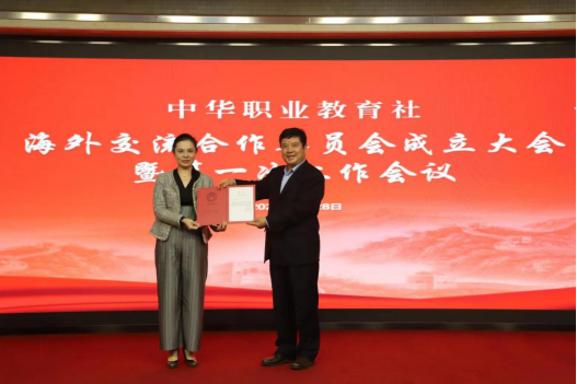 本次大会上,学校姜波理事长被特聘为中华职业教育社第十二届理事会海外交流合作委员会委员。国际交流中心王鹏主任代表姜波理事长接受聘用证书。