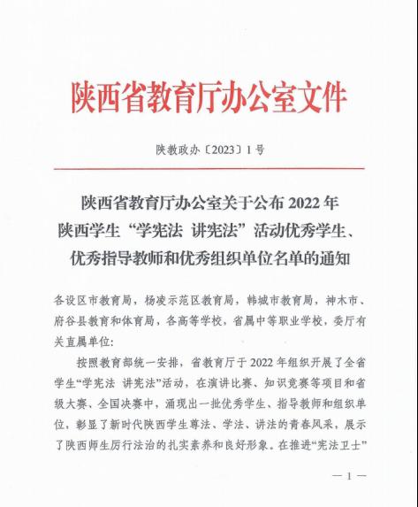 按照教育部安排,省教育厅于2022年组织开展了全省学生“学宪法 讲宪法”活动,包括演讲比赛、知识竞赛、“宪法卫士”行动等内容。近日,陕西省教育厅通报表彰2022年度“学宪法 讲宪法”活动优秀学生、优秀指导教师和优秀组织单位。我校因“学宪法 讲宪法”工作成绩突出,荣获2022年度优秀组织单位。