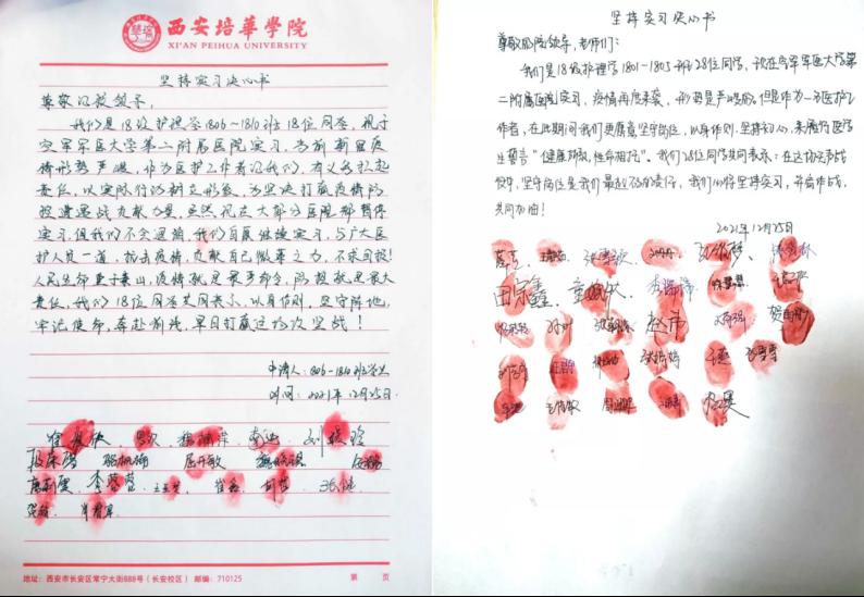 近日,受陕西疫情影响,学校考虑暂停校外实习计划,面对严峻形势,我校医学院护理系的实习生们纷纷写下《坚持实习决心书》,希望能继续实习,战斗在抗疫一线!