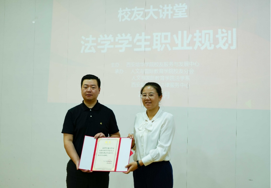9月28日下午校友服务与发展中心联合人文与国际教育学院特邀请2013届法学专业校友、华格律师事务所主任李涵宇在博远楼J201举办了一场关于法学毕业生职业规划讲座,人文与国际教育学院行政副院长南兵、教学副院长赵洁、法学系主任马亚乐及近八十位2023届法学专业毕业生参加了此次讲座。