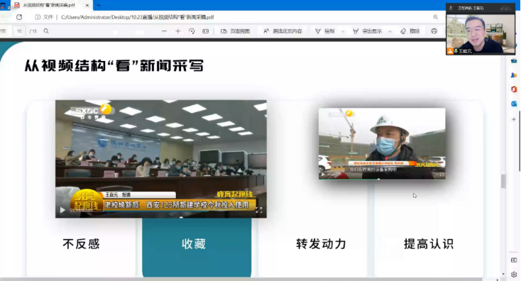王庭元校友用充满激情的语言,通过聊天的方式,引用了大量生动的例子,从划不走、讲故事、说干货、持续升华、精神传承包容五个方面,就视频新闻如何采写这一话题,展开了内容,他说为使视频新闻信息形成独特的风格,新闻编辑必须创新思路,寻找切口,注重细节,代入节奏,并增加自身对于新闻的素质和能力要求。我们写出好新闻,做好宣传思想工作,就要牢牢把握主动权,主动出击,等新闻出现,不如出去找新闻。树立创新思维,心中要常有好思路,想别人想不到的。