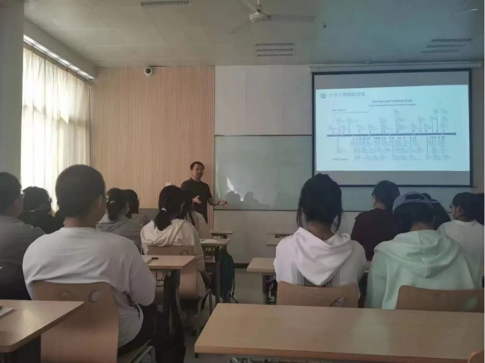 雷洋博士毕业于中国科学院上海有机所现代有机合成中科院重点实验室,曾在西安赛尔美生物医药科技有限公司任研发总经理,现任陕西君境迈德生物医药科技有限公司研发总经理,主要研究项目为药物中间体,小分子新药研发。他为同学们做了关于小分子药物研发的专题讲座,从小分子药物的发展历程到目前在上市新药中的占比,以及小分子药物与生物药区别为同学们开展了一场非常前沿的专题演讲,讲述到基于化学技术,涉足早期小分子药物研发领域的各个方面。化合物筛选库的建立,基于化合物各种性质的结构改造,临床前样品的合成方法研究、放大,杂质研究等。答疑环节同学们纷纷提出自己的问题,雷洋博士也为同学们一一解答,鼓励同学们认真、努力、坚持学习药学方面的相关理论知识,在以后的实习实践中能够独立自主的解决问题。