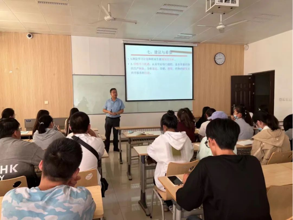 陈有亮教授是国家食品药品监督管理总局特聘执业药师工作专家,陕西省执业药师协会理事,国家教育部特聘中高职职业教育工作专家。在药学领域及执业药师培训上有着非常丰富的经验。陈教授于2022年9月29日从药物的起源与生命的重要性、药学专业介绍、工作单位(毕业去向)、提高学业的途径、建议与希望这几方面做了精彩的讲解,语言幽默诙谐、让同学们在轻松的氛围中学到了很多专业相关知识,同时对所学专业有了初步了解。最后陈教授还给同学的学习提出了建议和希望。