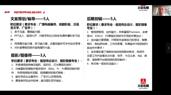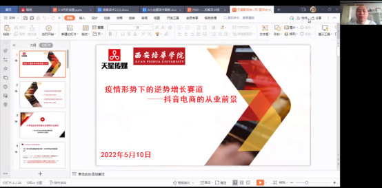 为了帮助传媒学院学生在疫情防控背景下准确有效地确定就业方向,明确个人职业规划方向,5月10日下午,传媒学院邀请到西安天星影视传媒有限公司创始人、2010届播音与主持艺术专业校友邱悦,通过线上会议的形式,进行了一场主题为“疫情形势下的逆势增长赛道:抖音电商的从业前景”的主题讲座,讲座由传媒学院乔安老师主持,传媒学院2019级、2018级学生代表百余人参加了本次活动。