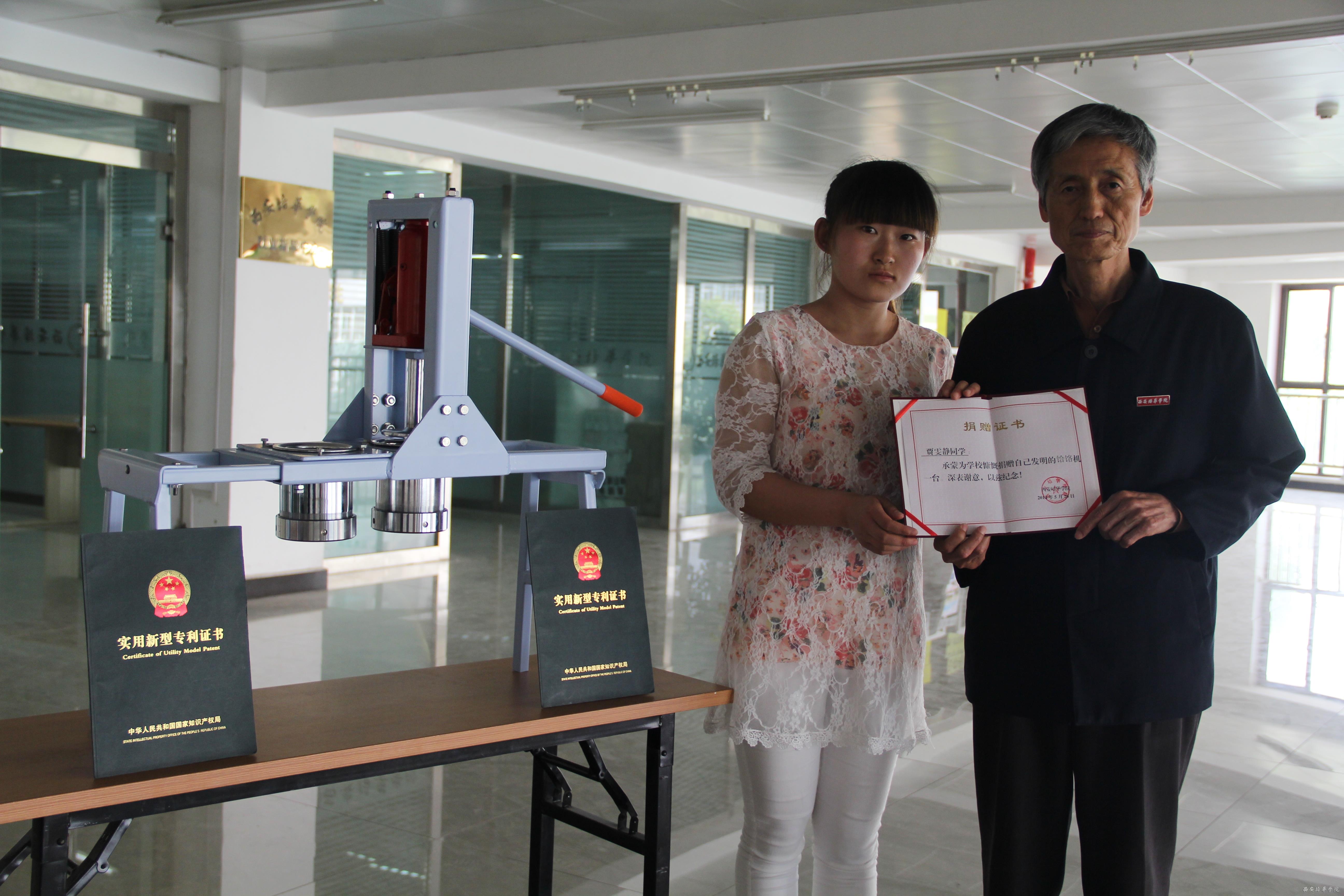 5月20日下午贾雯静同学为我校捐赠了自己发明的饸烙机一台,本次捐献会议在明德楼二楼大厅举行。出行本次会议的领导有段茂贤副校长、就业办王琳副主任和主管校友会李志安老师。捐赠仪式开始前段茂贤副校长代表学校为贾雯静颁发了捐赠证书,贾雯静同学对自己发明的饸烙机做了简单的介绍,贾雯静说:目前,在进行饸烙机的加工时,通常是将和好的面团放入底部具有若干通孔的加工容器中,之后通过挤压工具对容器内的面团进行挤压,面团受压后由容器底部通孔被挤出,即加工成饸饹。但是,目前的加工装置多为手动,通过人力对面团进行挤压,效率低下,并且加工者极为费力。
