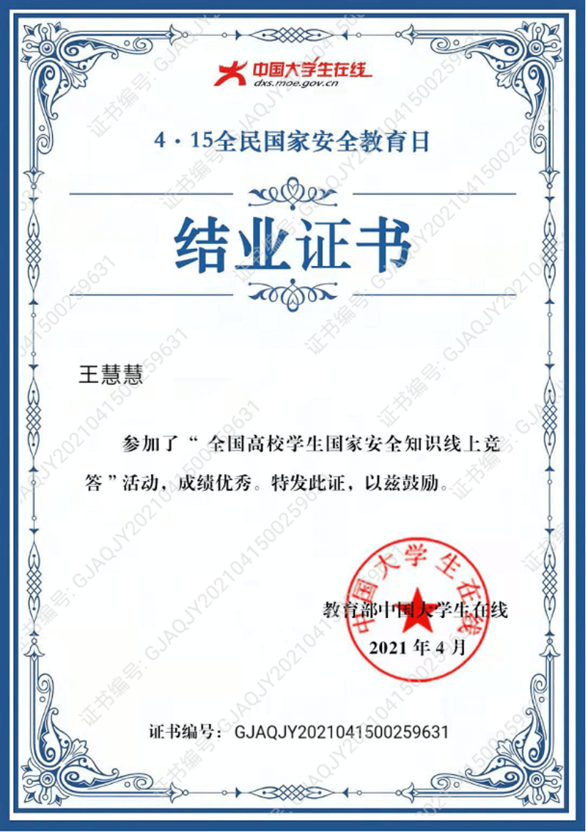 5.2021年获全国高校学生“4·15全民国家安全教育日”安全知识线上竞答活动结业证书