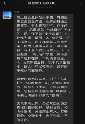 会计与金融学院以“靶向设计”为核心,采用“集体研讨与随机检查”双规模式,根据学生服务中心每周班会工作提示,依托学校辅导员精心编纂的《班会集》(即‘学工君教你开班会’),紧密融合时政热点与学生实际需求,匠心设计班会主题,搭建“三个一”工程,即一周一备,一周一查,一周一研讨,形成闭环管理,定期开展姜维之研讨、学风建设、文明行为养成班会,同时结合传统节日,开展传统节日文化学习,“非遗文化”学习班会,并且融入社区工作,借助“双导师制”平台,通过学业导师的“每周一约”定期指导与辅导员的微课堂互动,进一步强化社区育人的实际效果,将红色教育融入思政大课堂。