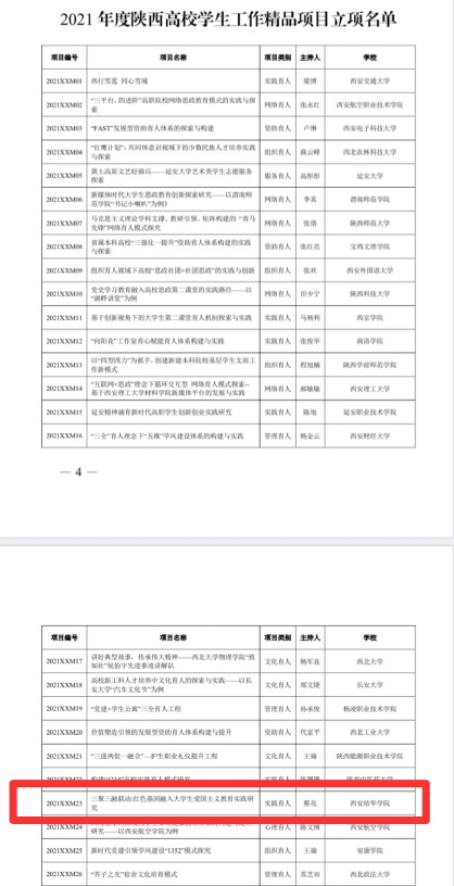 根据《关于公布2021年度陕西高校学生工作精品项目和研究课题立项名单的通知》的文件,我校党委学生工作部蔡亮主持的《三聚三融联动:红色基因融入大学生爱国主义教育实践研究》获得“学生工作精品项目”立项,传媒学院高嘉炜主持的《 新时代陕西民办高校辅导员培训体系构建研究》获得“学生工作研究课题”立项。