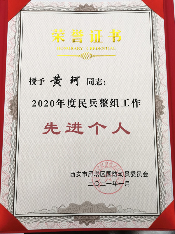 我校党委学生工作部(征兵工作站)黄珂同志被西安市雁塔区国防动员委员会评为“2020年度民兵整组工作征兵工作先进个人”