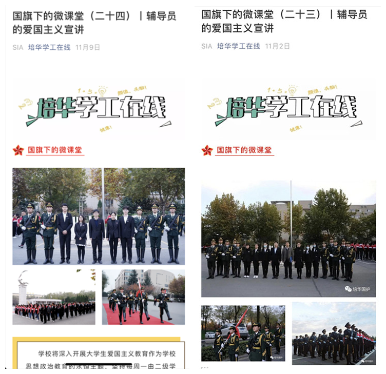 开展“国旗下的微课堂——辅导员爱国主义宣讲”活动。党委学工部协同各二级学院党委书记(副书记)、辅导员每周一早上7:00在南门国旗广场下,开展国旗下的微课堂——辅导员爱国主义宣讲,向学生开展“五个认同教育”,促进各民族同呼吸、共命运、心连心,铸造中华民族共同认同的舆论纽带。