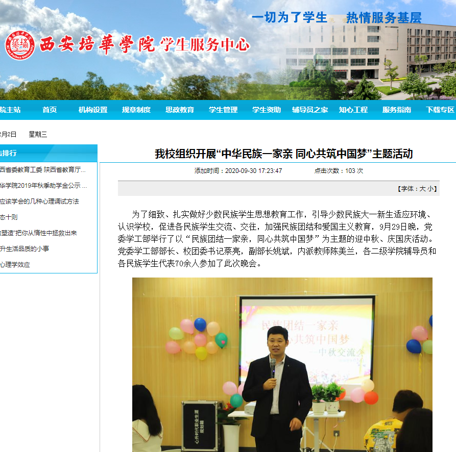 利用多媒体平台开展活动。通过“两微一端”平台(西安培华学院“培华学工在线”和“培华青年”微信公众平台、西安培华学院校媒官方新闻网站)等多重载体和有效途径开展“民族团结一家亲,同心共筑中国梦”活动。各学院学生组织网络平台等各种宣传阵地,大力开展民族团结进步宣传教育,大力弘扬社会主义核心价值观,创新教育方法,用主旋律占领主阵地。激励学生树立成长成才、报效祖国的强烈愿望,切实肩负起应有的社会责任,促进民族间大团结,共创和谐校园。