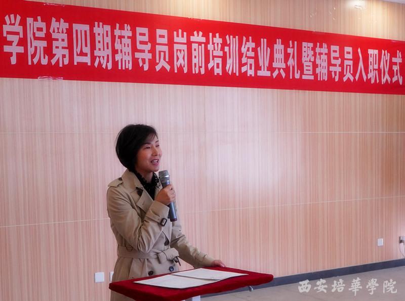 为进一步加强学校辅导员队伍建设,全面提高新辅导员的综合素质与工作能力,促进其快速熟悉大学生思想政治教育政策、规律和方法,帮助新入职辅导员深入了解岗位职责和任务目标。11月14日下午,学生服务中心在恒友楼一楼南侧学生团体辅导室开展了西安培华学院第四期辅导员岗前培训结业典礼暨辅导员入职仪式,副校长、党委副书记姚文静,学工部副部长、团委书记蔡亮,各二级院系的领导及全体辅导共100余人参加了活动。