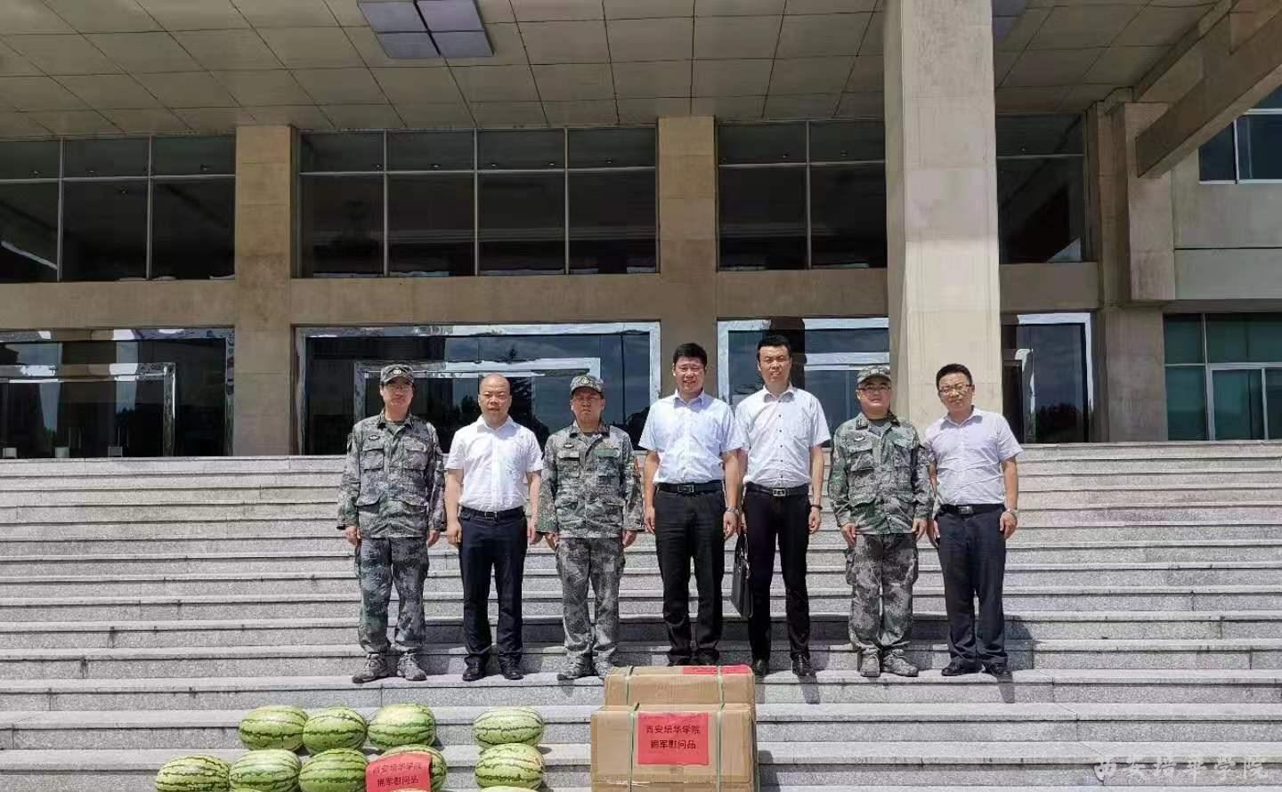 7月25日,在第92个建军节来临之际,西安培华学院校党委委员蔡亮、学生服务中心副主任张静远,智能科学与信息工程学院党总支书记南兵,校团委副书记屈先锋,学生服务中心思政主管王飞一行五人前往宝鸡我校军训承训部队(解放军32147部队)进行慰问,受到部队领导的热情接待。